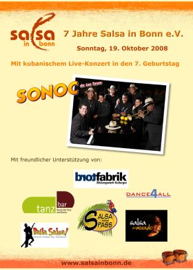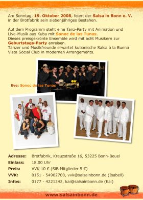 Am Sonntag, 19. Oktober 2008, feiert der Salsa in Bonn e. V. in der Brotfabrik Bonn sein siebenjähriges Bestehen. Los geht es um 16.00 Uhr. Opening mit einem Ständchen unserer eigenen Musik-Gruppe Bonna Fiesta Salsa Club im Gastro- und Foyer-Bereich. Der Gastrobereich stellt sich auf unser Thema ein
