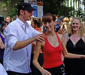 Um 14.30 Uhr eröffnete Frau OB Bärbel Dieckmann das Fest. Gleich im Anschuss brachten Knut und Christine die Hüften zum Schwingen und animierten zum Mitmach-Tanz. Zum Abschluss der Präsentation Salsa gab es eine Rueda des Donnerstag-Kurses von Christine.